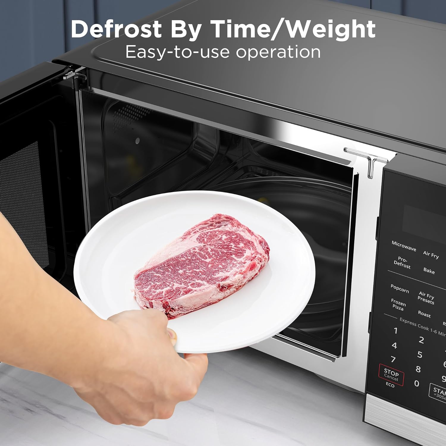 The large interior is ideal for family-sized dishes or bigger plates, and features like auto defrost and multiple preset menus help simplify everyday use. ECO mode saves energy when the microwave isn’t running, and the mute option lets you use it quietly when needed.